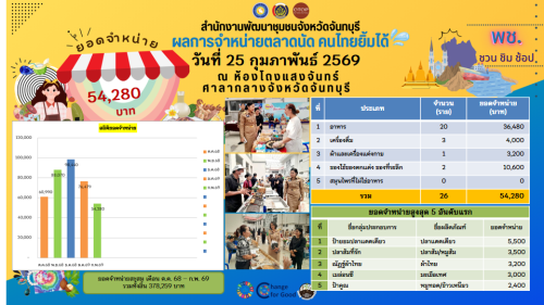 ทั้งนี้ มีกลุ่มผู้ผลิต ผู้ประกอบการ เข้าร่วมจัดแสดงและจำหน่ายผลิตภัณฑ์ จำนวน 26 ราย และมียอดจำหน่ายรวมทั้งสิ้น 54,280 บาท แยกเป็น